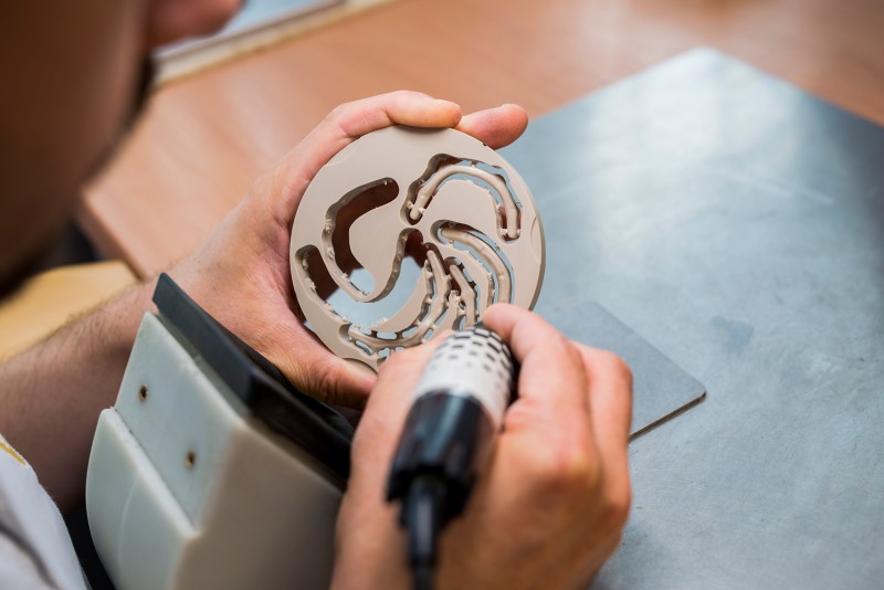 Die Fertigung von PEEK-Prothesen erfolgt computergestützt: Der Zahnersatz wird am Bildschirm modelliert und anschließend mit hochpräzisen CAD/CAM-Systemen aus einem Rohling passgenau herausgefräst. Dieses Verfahren führen wir in unserem Zahnlabor präzise und sorgfältig durch, damit die Zahnversorgung optimal funktioniert und angenehm sitzt. Die PEEK-Prothese wird mit Composite verblendet. Durch individuelle Farb- und Formgebung wird der Zahnersatz schließlich optisch angepasst.