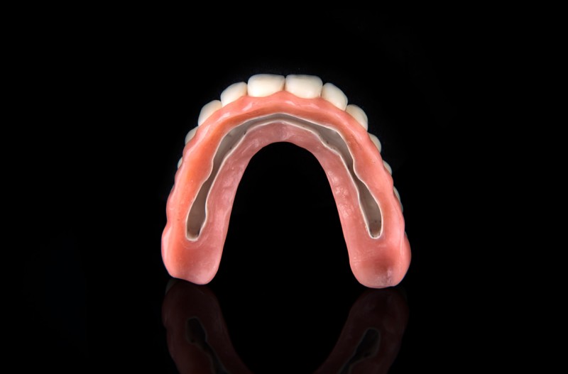 Für eine Totalprothese im Unterkiefer ist die Herstellung aufwendiger. Bei der Fertigung in Hufeisenform muss darauf geachtet werden, dass die Zunge genügend Spielraum hat.