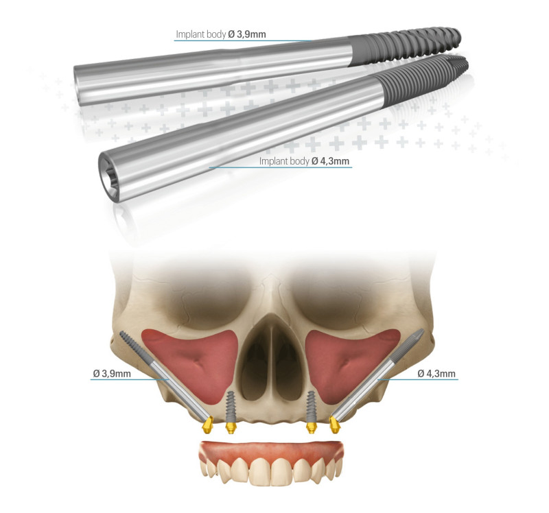 Diese Technik ermöglicht auch Patient:innen mit extremem Knochenverlust im vorderen Oberkiefer die Versorgung mit festen, definitiven Zähnen. Meist werden sie in Kombination mit Zygoma- und/oder Pterygoid-Implantaten eingesetzt, um den gesamten Kiefer zu stabilisieren. Sie bieten eine hervorragende Alternative zu komplexen chirurgischen Eingriffen oder herausnehmbaren Prothesen.