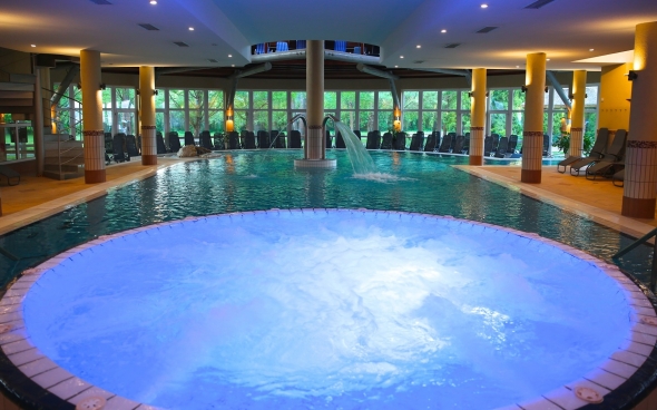 Gelegen im Herzen von Hévíz, in einer stillen Seitengasse, nur ein paar Gehminuten vom Thermalsee und Stadtzentrum entfernt, verfügt das "Hotel des Jahres 2014" über eine hervorragende Wellnessanlage, und bietet eine Vielzahl von wohltuenden, verwöhnenden und medizinischen Behandlungen. Über 700 Quadratmeter Wasseroberfläche, Saunalandschaft, Therapie-, Beauty- und Lasercenter und eine Zahnklinik garantieren die rund um Erneuerung.