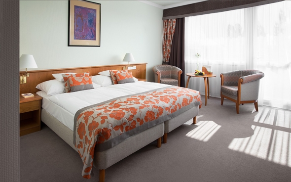 250 klimatisierte Zimmer, 5 Appartements, 3 Familienappartements, 1 behindertengerechtes Zimmer, 1 kleinere und 1 größere Präsidentensuite erfüllen alle Erwartungen an ein Vier-Sterne-Superior Hotel. Zentral gelegen, in einigen Gehminuten vom Thermalsee entfernt, jedoch in einem 4 Hektar großen Park, bietet das Hotel Carbona ↗ selbst an die 1000 Quadratmeter Wasseroberfläche und gilt als richtige Bade- und Wohlfühloase.