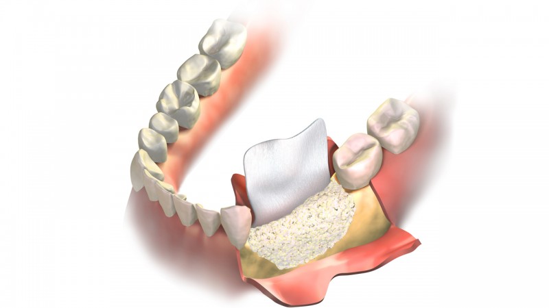 - synthetisches Knochenersatzmaterial (Salzkristalle), das der behandelnde Zahnarzt auf die Fläche im Knochen streut, die aufgebaut werden soll. Sobald sich die Kristalle mit Blut vermischen, startet der etwa drei- bis sechsmonatige Knochenaufbauprozess.